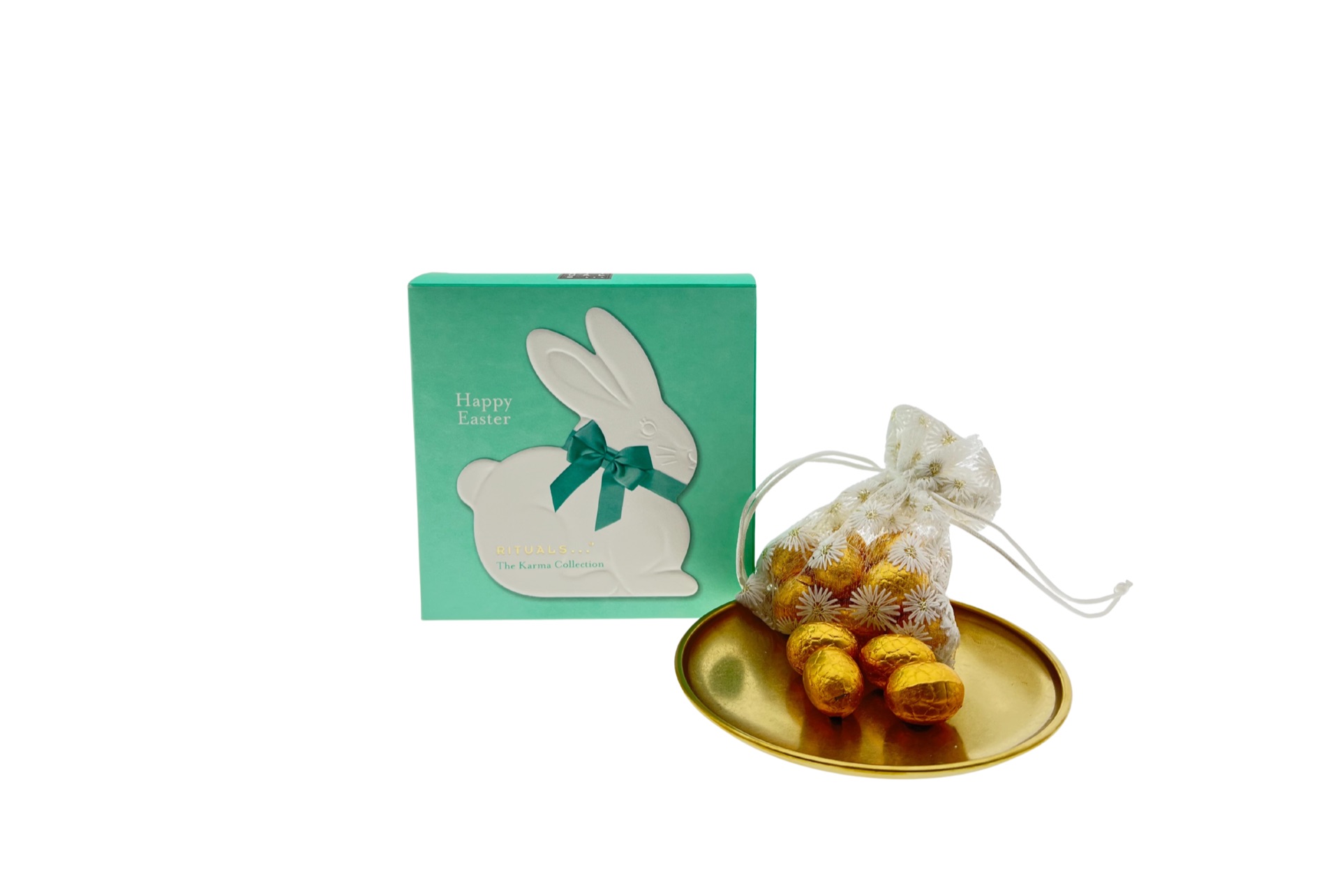 Happy Easter ritualsset Karma met een showerfoam 50ml, body oil 30ml en een body cream 70ml een gouden plateautje en een organza zakje gevuld met gouden paaseitjes. Bekijk alles