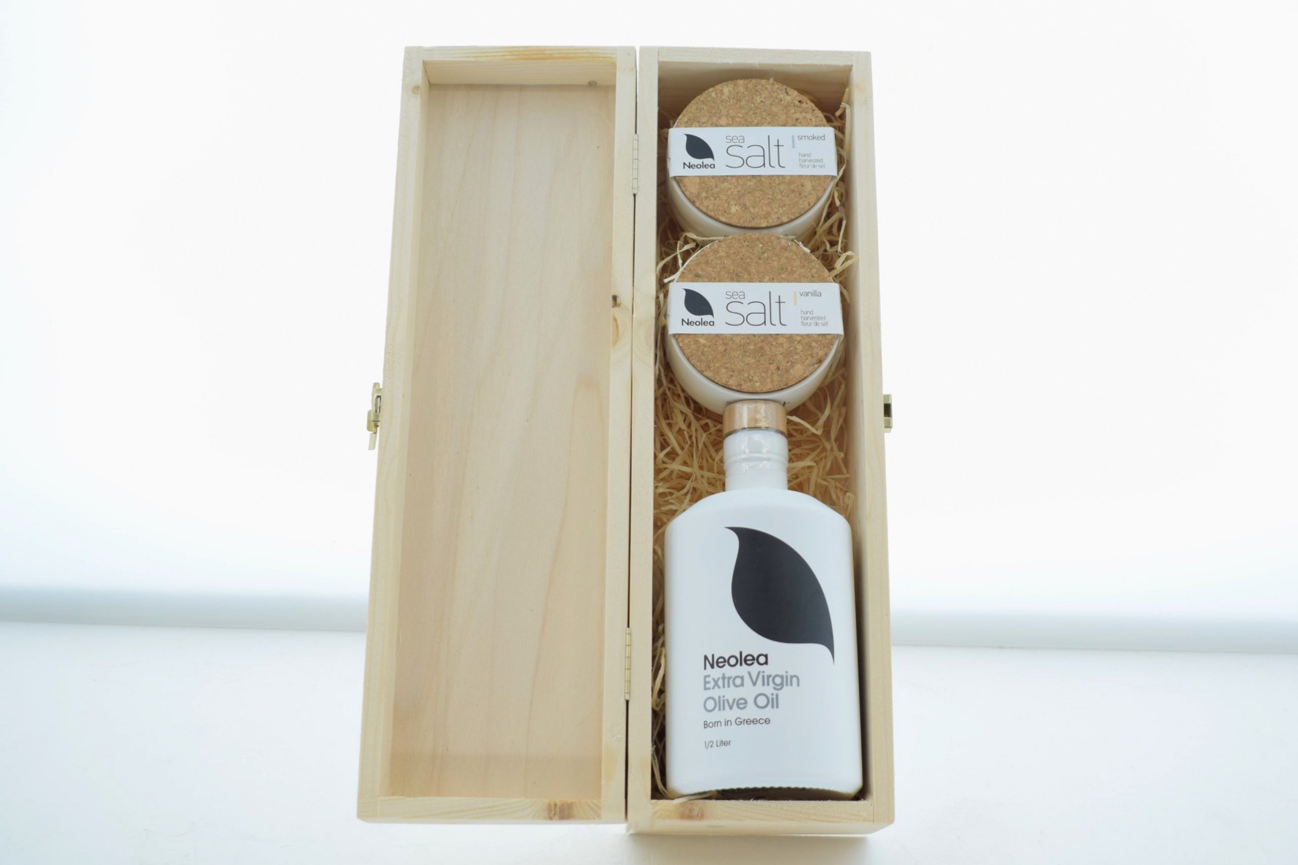 Deze olijfolie van Neolea is een volledig verse en 100% pure extra vierge van de hoogste kwaliteit. Geproduceerd in Griekenland, rechtstreeks van de olijfgaard gebotteld in een stijlvolle fles met het prachtige detail van een olijfhouten dop. Dit in combinatie met hoge kwaliteit zeezout in gerookte en vanille smaak is een uniek en lux geschenk.- Neolea extra vierge olijfolie 500 ml